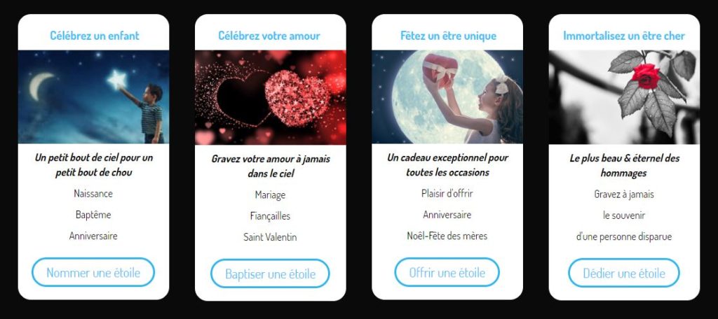En offrant une étoile à vos proches, vous faites un cadeau intemporel qui durera toujours. C’est assez incroyable de se dire qu’on a une étoile à son nom. Si vous vous décidez (cliquez-ici pour découvrir les différents packs), vous recevrez un certificat, un joli poème, et les indications précises pour retrouver la constellation si un jour vous observez les étoiles.