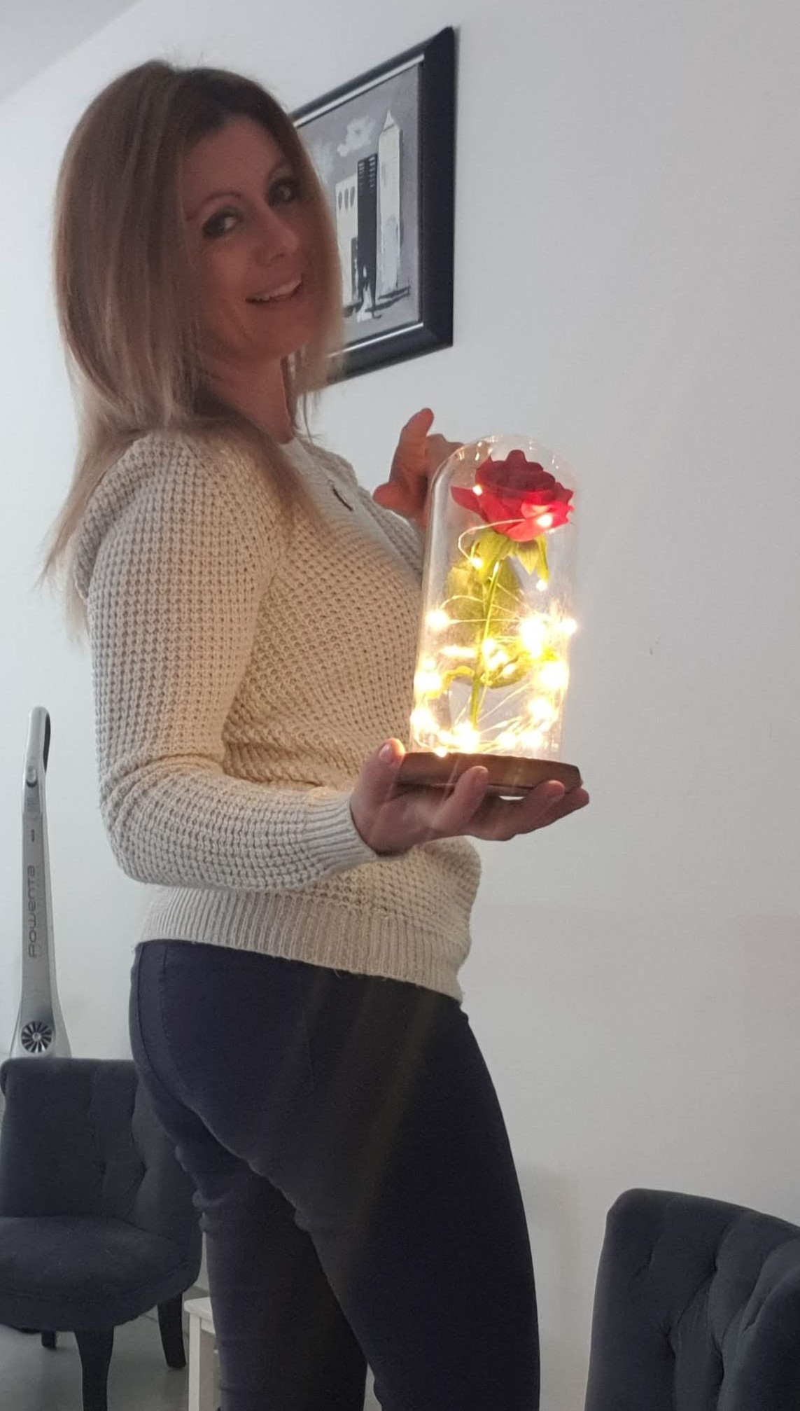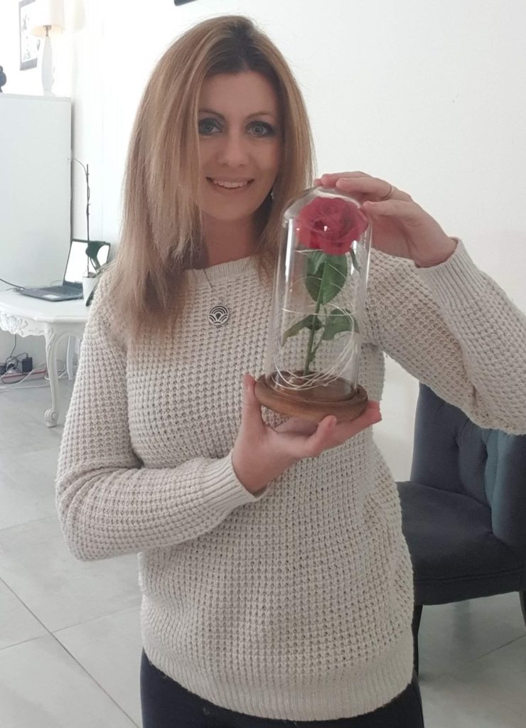 La lampe se compose donc d’un socle en bois dans lequel on insère trois petites piles. Le socle est monté d’une cloche en verre. A l’intérieur se trouve la rose rouge, et le filin lumineux. Je vous avoue que j’ai soulevé la cloche pour vérifier que c’était une fausse fleur car elle fait vraiment vraie !